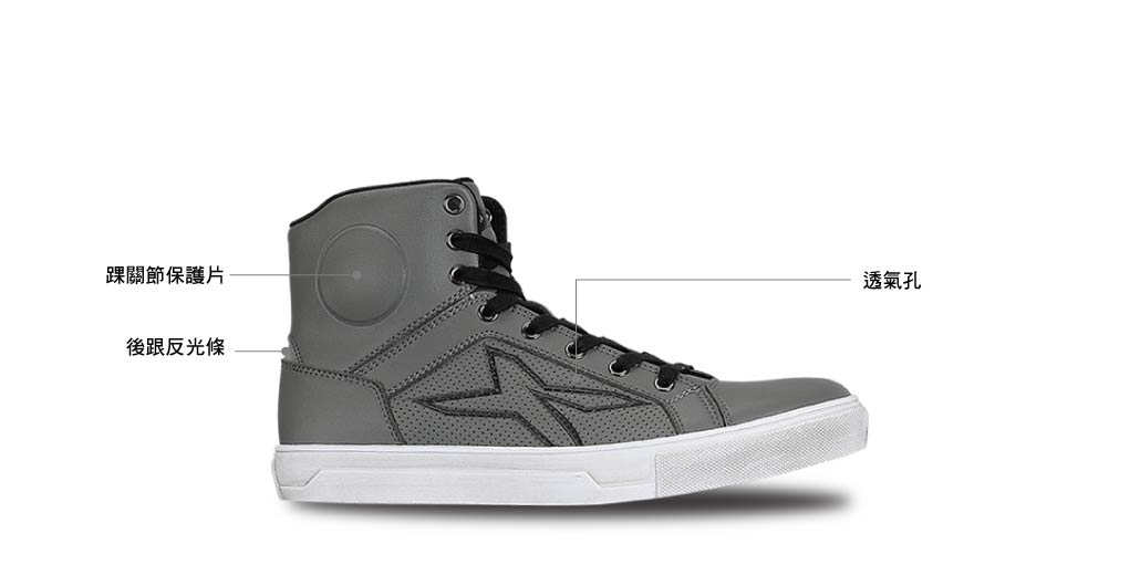 強化結構 針對鞋頭及後跟都有強化結構及補強系統,在腳踝處增加了隱形式保護片,高密度柔軟填充物以吸收衝擊力,在易磨損疊片部位使