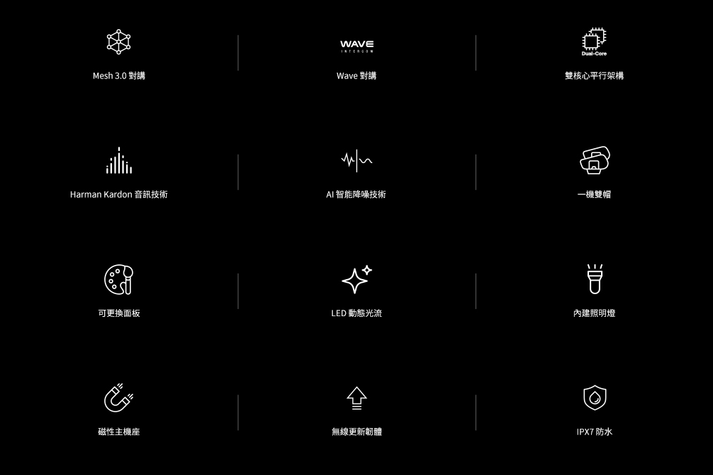 60S 採用平行架構的雙核心 CPU,提供超乎想像的多工處理效能。輕鬆管理多個設備連接,同時享受靈活的通訊選項,例如公開模式、網狀群組、藍牙對講和革命性的 Wave 對講。先進的雙核心架構也支援完美的音訊多工處理,讓您在參與對講對話的同時享受您喜愛的音樂。