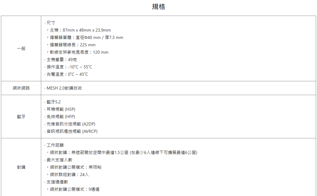 最多支援24人的網狀群組則提供隱密性的小群組對講,切換模式極為方便。在開放空間中,雙機最遠1.5公里,6人以上連線可達6公里,