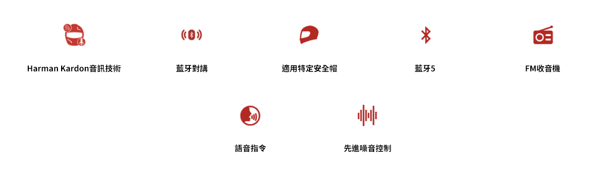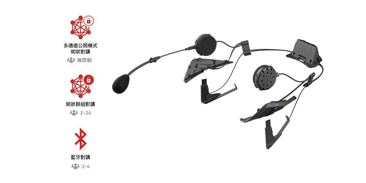 | 對講 | 連線距離: ● 藍牙對講:最遠2公里,在空曠區域 ● 網狀對講:最遠2公里*,在空曠區域 (*在最少6位騎士連線下,可擴展至最遠8公里) 最大支援: ● 藍牙對講:4位騎士 ● 網狀公開模式:無上限 ● 網狀群組:24位騎士 支援通道: ● 公開模式:9通道 |