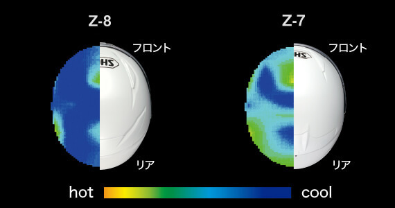 這是當時速100 km / h的風時大約1分鐘時頭盔內部溫度下降的彩色圖表,整個頭盔的冷卻速度比Z-7快。