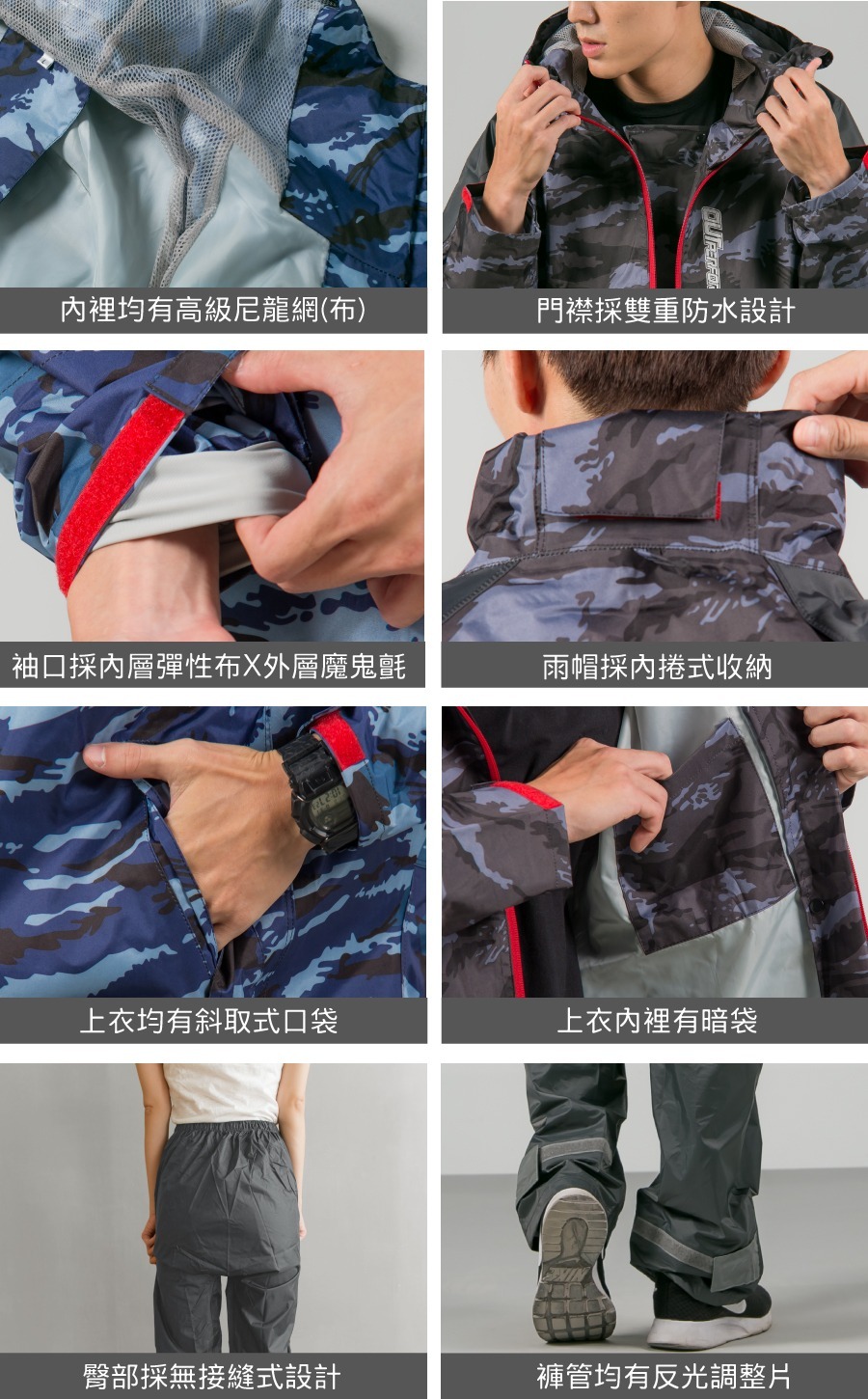10.雨褲/屁股部分採一片式無接縫設計(降低滲雨機率)